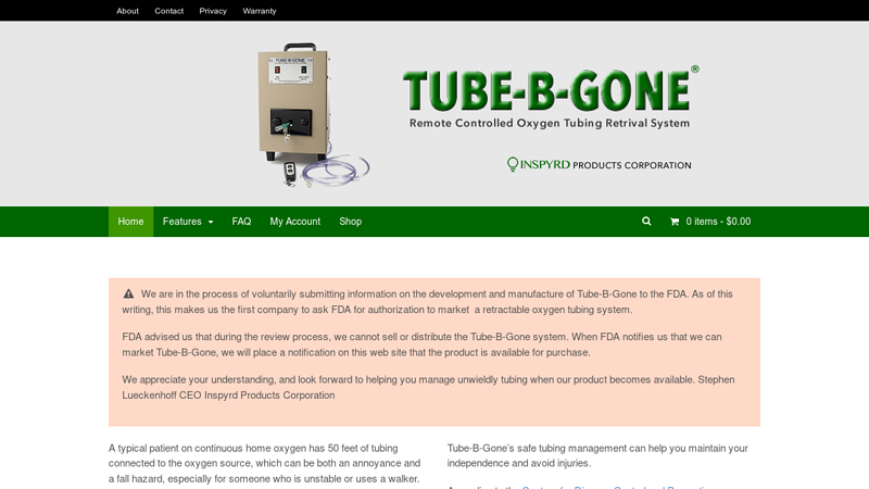 Key Highlights: Oxygen patients use Tube-B-Gone to retrieve and wind up to 50 feet of oxygen tubing into the device by pressing a remote control, similar to a car key….